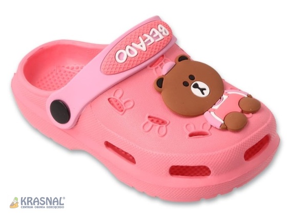 Klapki dziecięce z paskiem na piętę z misiem na przodzie.