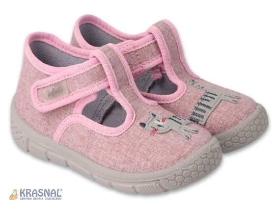 Dziewczęce kapcie firmy Befado w śliczne szare kotki podobają się małym dziewczynkom. Doskonałe jako obuwie domowe, przedszkolne i szkolne.