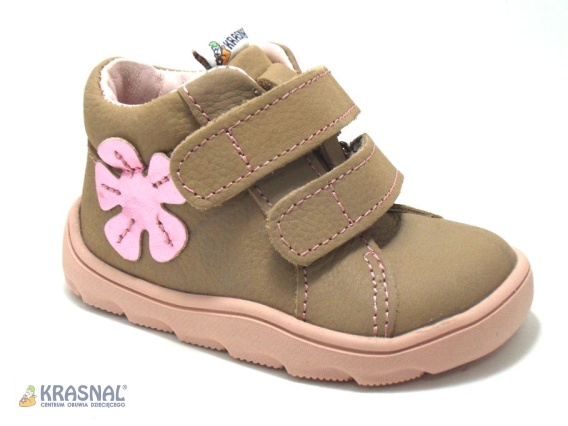 Buty wykonane w całości ze skóry naturalnej w kolorze beżowym z różowym kwiatkiem na boku.